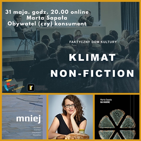 autor: Biblioteka, dnia: 27.05.2020W najbliższą niedziele, 31 maja o godz. 20.00 Faktyczny Dom Kultury zaprasza na wirtualne spotkanie live z cyklu Klimat Non-Fiction: Obywatel (czy) konsument. Organizatorzy gościć będą dziennikarkę Martę Sapałę, autorkę poruszającą w swoich publikacjach tematykę postaw i wyborów konsumenckich.